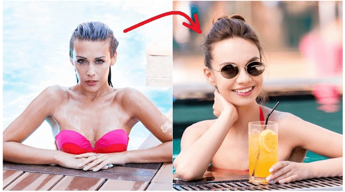 Фотографируясь у края морского пирса или гостиничного бассейна, старайтесь избегать напряженных поз с упором на локти. Взгляните, как напряжены лицо, шея и плечи девушки на фото слева и во что это можно преобразить, следуя образцу на фото справа. Все, что нужно сделать, — это улыбнуться (что молодит всех без исключения) и немного расслабить хотя бы одну руку (особенно если эта рука намного массивнее, чем у изображенной здесь модели), а вторую заслонить или коктейлем, или шляпой.