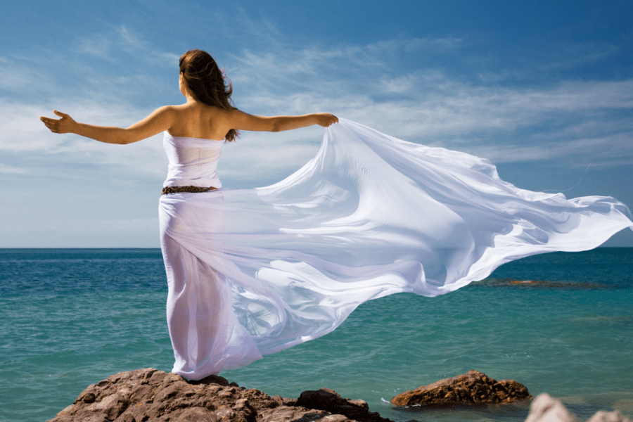 Ну, а если денек выдался слишком ветреным, то ветер на пляже может создать воистину потрясающие образы! Попробуйте сняться на фоне высокой пенящейся волны, накатывающих облаков или раскачивающихся за вами деревьев. Можете использовать изображенную ниже идею, превратив ветер в вашего усердного помощника. Посмотрите, как красиво он развевает здесь парео девушки!