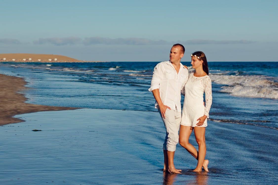 Посмотрите, как прекрасно смотрится эта пара в красном, синем и белом на фоне аквамарина морской воды! И это совсем не единственный пример того, как хорошо гармонируют любые оттенки голубого и синего, которые ранее отвергались знатоками сочетаемости цветов. Да и другие варианты тоже будут выглядеть не хуже. Контрастирующие с окружающим пейзажем цвета работают здесь, на пляже, на вас всегда!