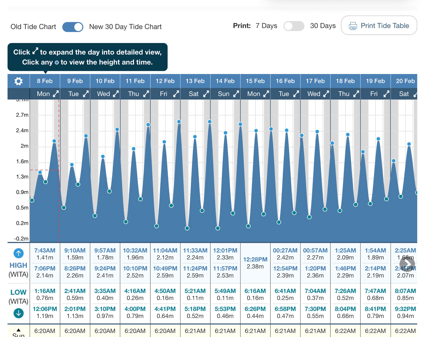 Основная часть экрана занята графиком с часами и показателями уровня воды. Точку можно перемещать по всей линии волны, чтобы увидеть самые точные значения.