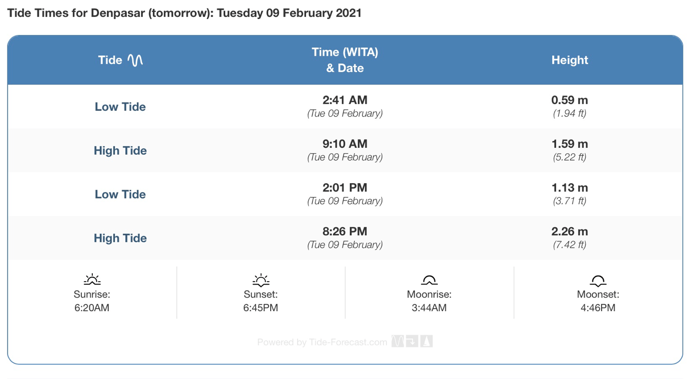 Можно набирать в поиске график конкретного пляжа. Таблица будет выглядеть по-другому и, возможно, даже время и уровень воды будут чем-то отличаться от графика для Денпасара, но эти отличия будут несущественными.