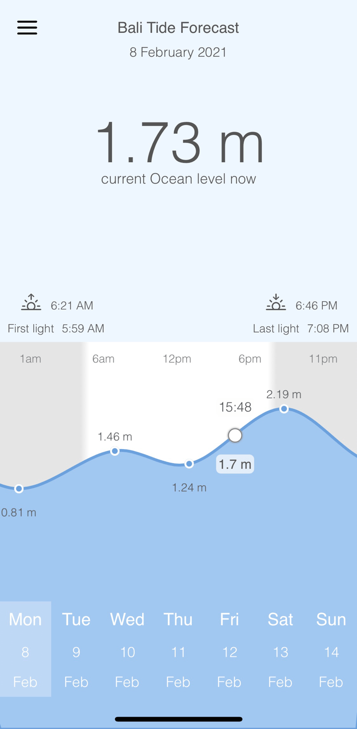 Приложение для телефона Bali Tide Forecast (пока только для iOS) очень простое в использовании на каждый день. С включенной локацией данные будут точнее. Здесь нам дадут минимальный объем информации, который необходим. Дата — вверху, дни недели с датами — внизу.