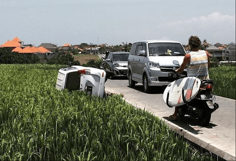 Важный момент: в районе Чангу узкие улицы и огромное количество рисовых полей, залитых водой. Многие дороги проходят рядом с плантациями, а так называемые шорткаты — прямо по ним. И 4-колесный и 2-колесный транспорт одинаково рискуют свалиться с дороги в результате неловкого движения руля. Будьте предельно внимательны за рулем!
